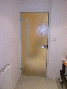 Claustra en verre Sécurit granité avec pinces à verre et support poteau en inox brossé